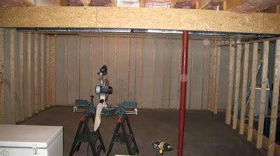 The back wall was pretty straight forward. Because I'm going to have a drop ceiling in this area, I planned to run the stud walls less than full height. This made building a lot easier (and quicker) because I could just cut to length, build on the floor and tip up into place. Once positioned, I glued and nailed into the concrete and then created ties into the joists to locate the top plate plumb.